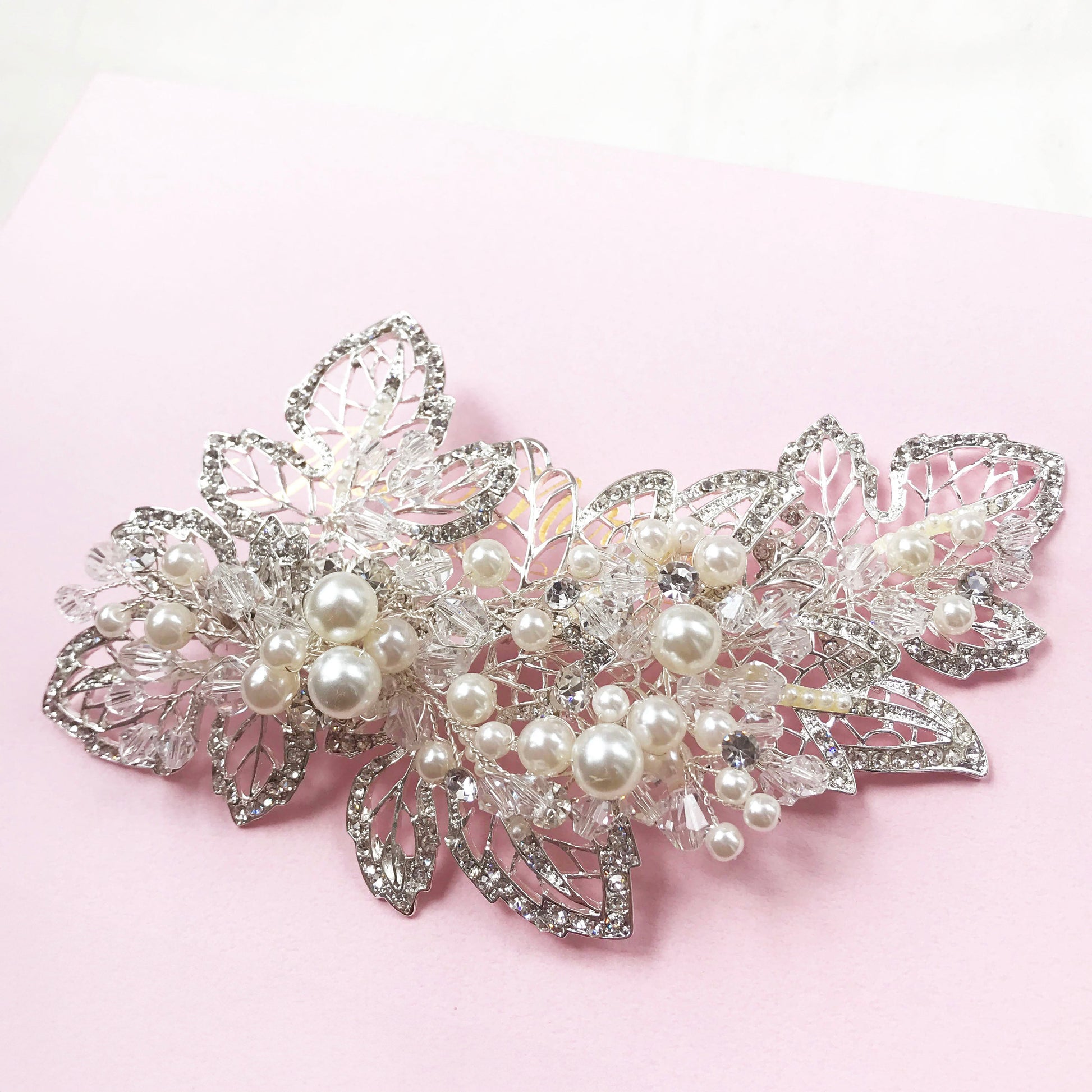Add a touch of sparkle and shine to any wedding look with this Japanese-made pearl and crystal leaf hair accessory – perfect for setting off those special moments of your day.
