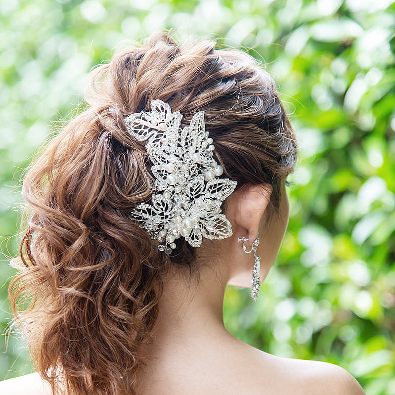 日本製 (預訂) 珍珠水晶石鑲嵌葉子髮飾 (付夾子)