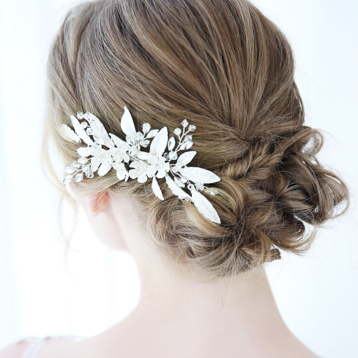 日本製 (預訂) 銀色小花葉子拼水晶白珠髮簪 (3 件套裝)
