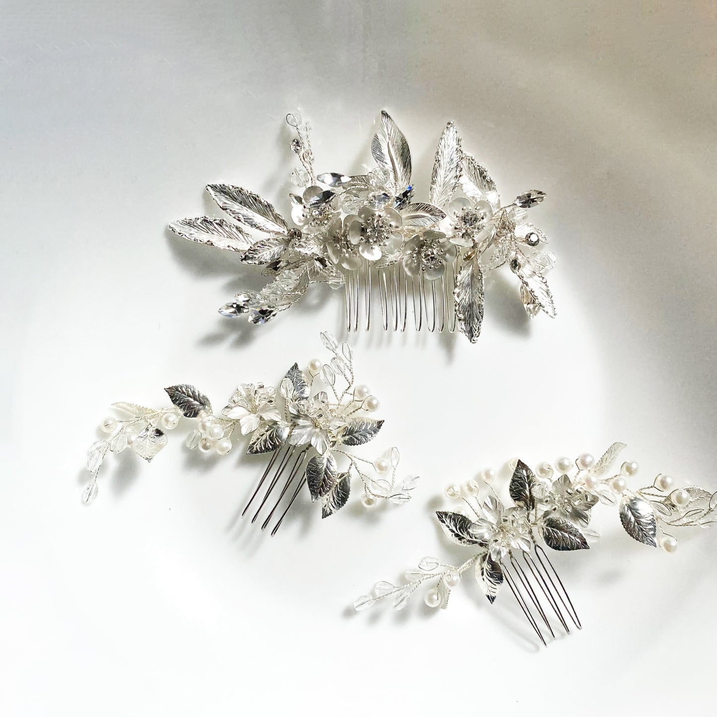 一套3 件髮簪頭飾套裝令髮髻造型更百搭,隨着你的髮型可展現不同的高貴典雅感覺,可完美配襯新娘子的婚紗/ 晚裝造型。 更可作為與伴娘相襯同一系列之用。