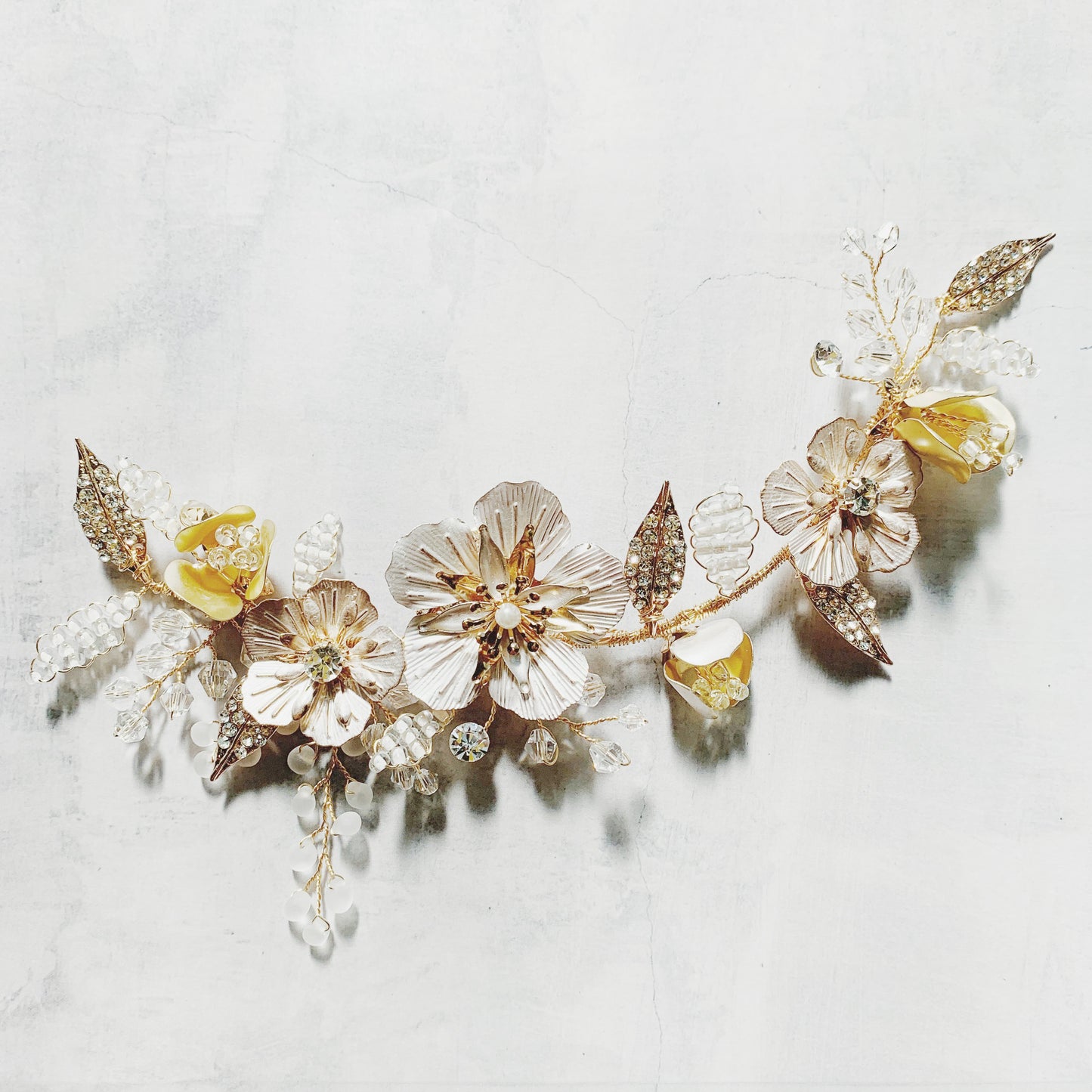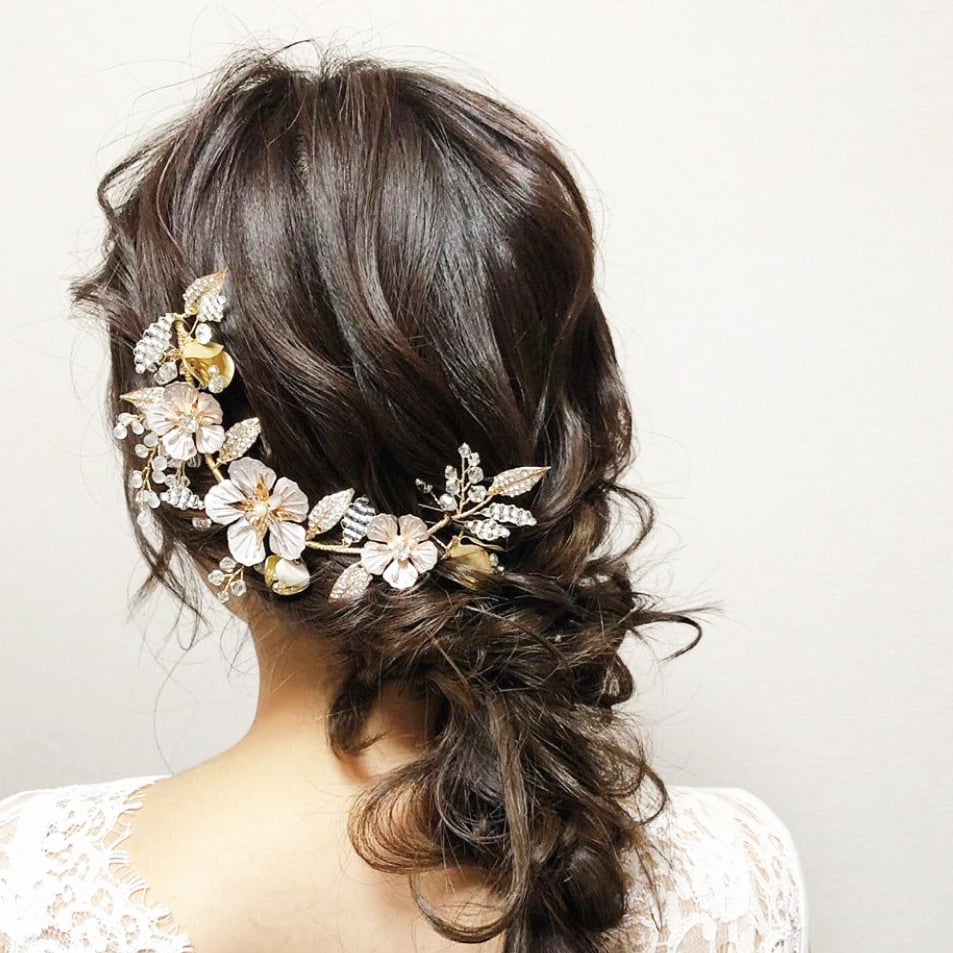 日本製 (預訂) 複古風玫瑰金花卉髮飾 水鑽葉子和透明珠枝葉予人華麗的感覺。複古風玫瑰金花卉髮飾由柔軟的金屬絲製成,可以改變彎曲角度配搭辮子 / 盤起髮髻造型。