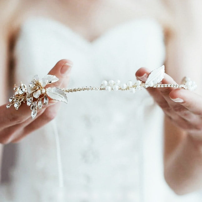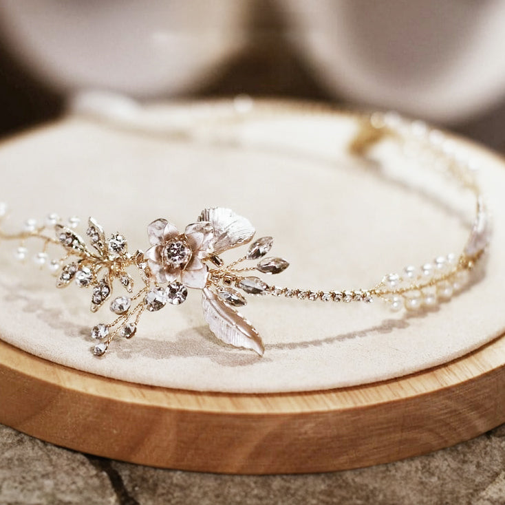 簡約清新的設計為喜愛「小清新」頭飾的新娘子帶來完美的選擇,輕花漫舞白珠晶石髮飾除了可於 PRE-WEDDING 時配襯一身輕盈裝扮,日後更可在宴會時大派用場。