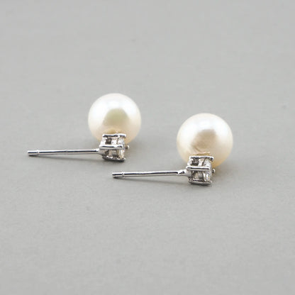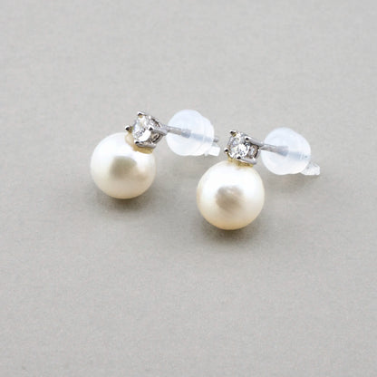 日本 AKOYA 米白珍珠水晶鈍銀穿針耳環 (7.5-8mm)
